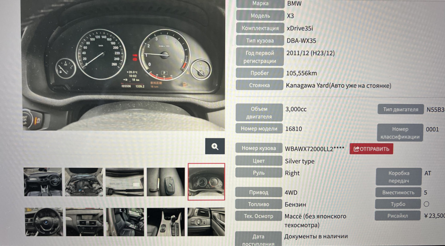 Дорестайлинг! BMW X3 F25 3.0 л.  Правый руль из Японии!  Отличное состояние! Заметны следы эксплуатации!   Color A14 mineral-silber.  Цвет салона: LUSW Кожа "Nevada"/черн.   Год выпуска 11.2011.  Пробег по Японии 105 т.км!